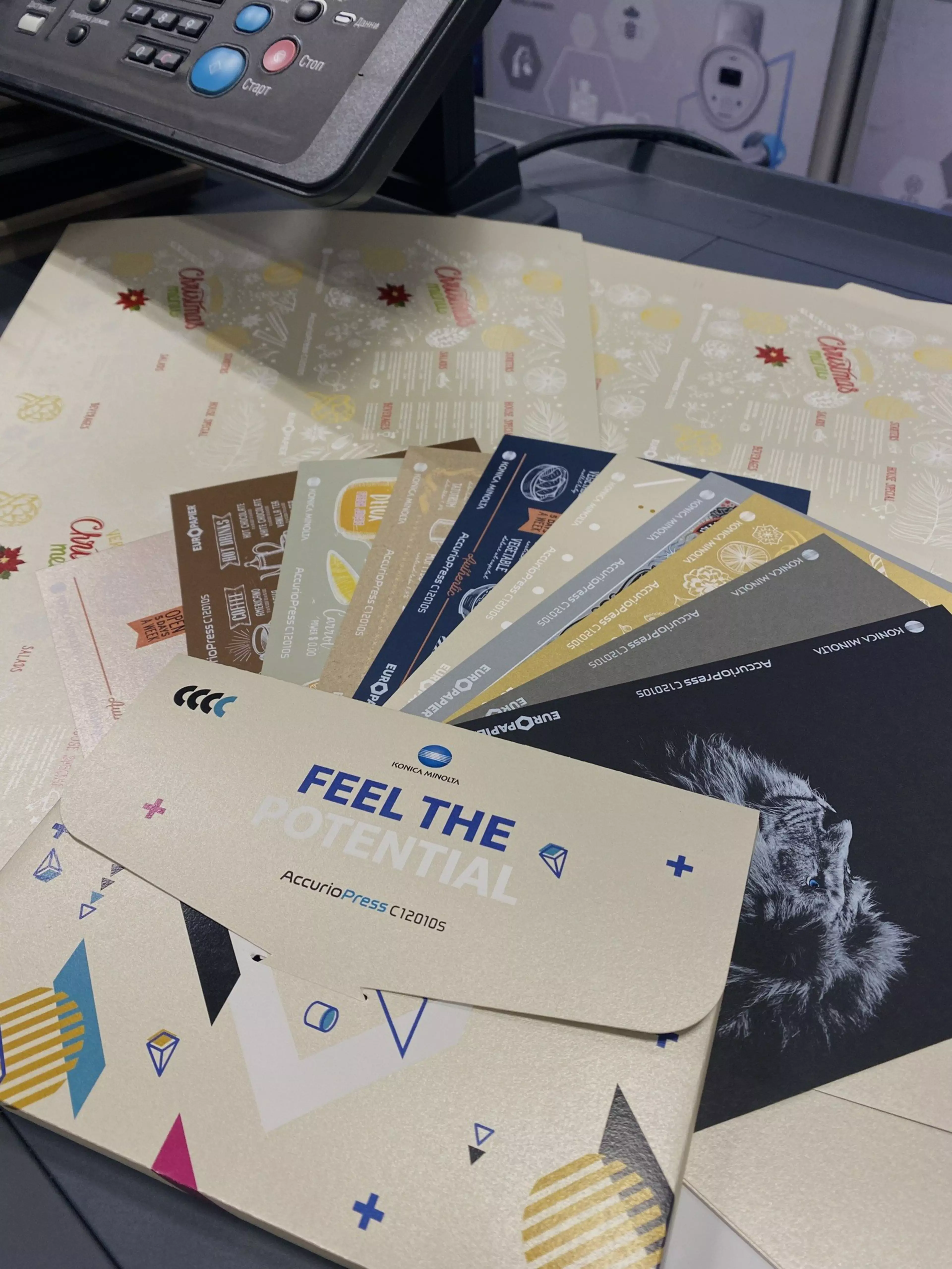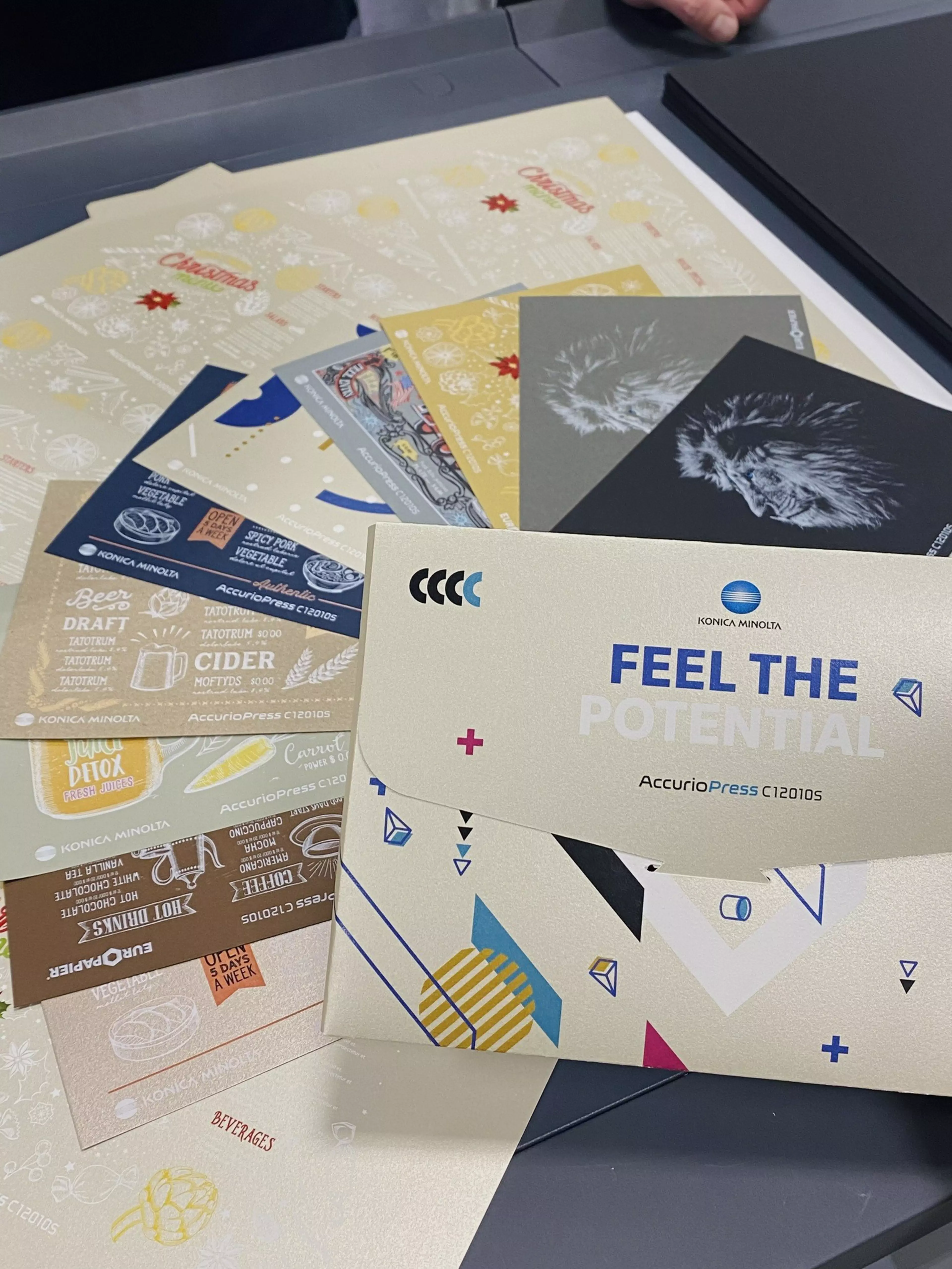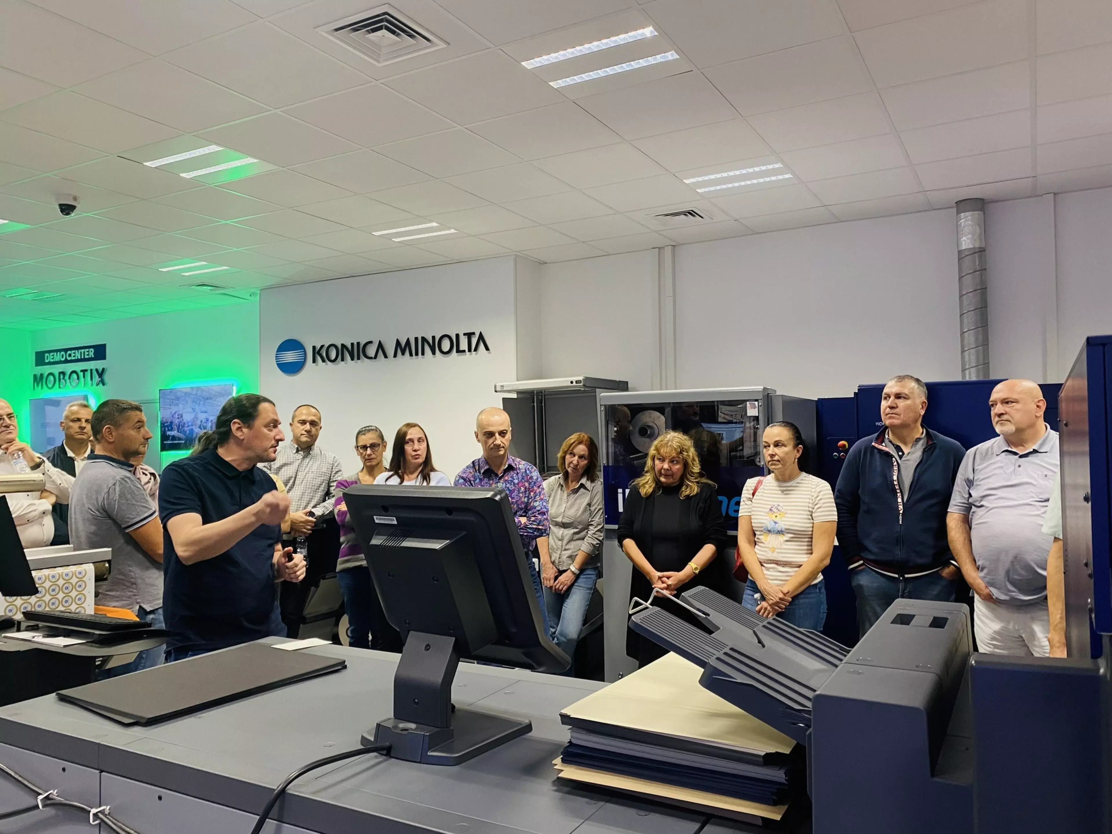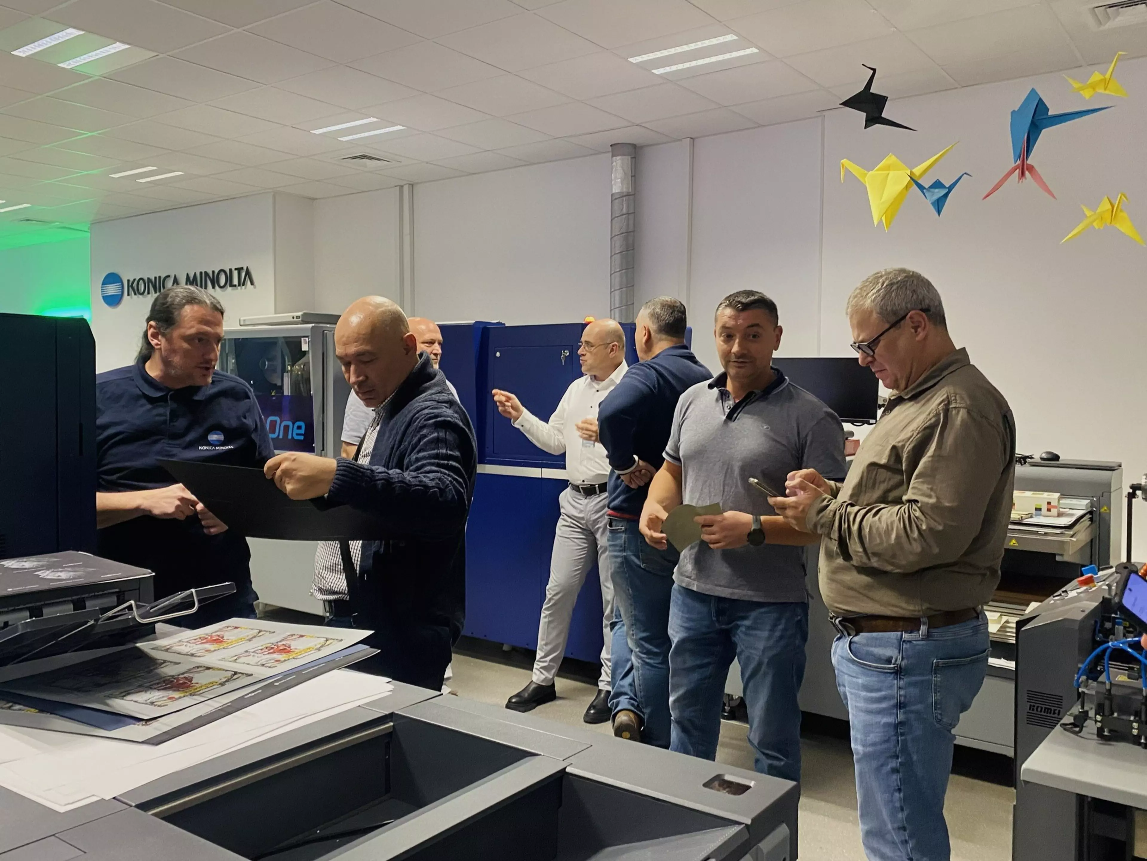 В практическата част гостите проследиха демонстрация на живо на печат с бяло на AccurioPress C12010S върху различни видове хартии и материали – от крафт и перлени до тъмни и метализирани повърхности. Демонстрацията беше водена от Кирил Костадинов, DIS оператор в Коника Минолта България, който представи възможностите на системата с прецизност и внимание към детайла.