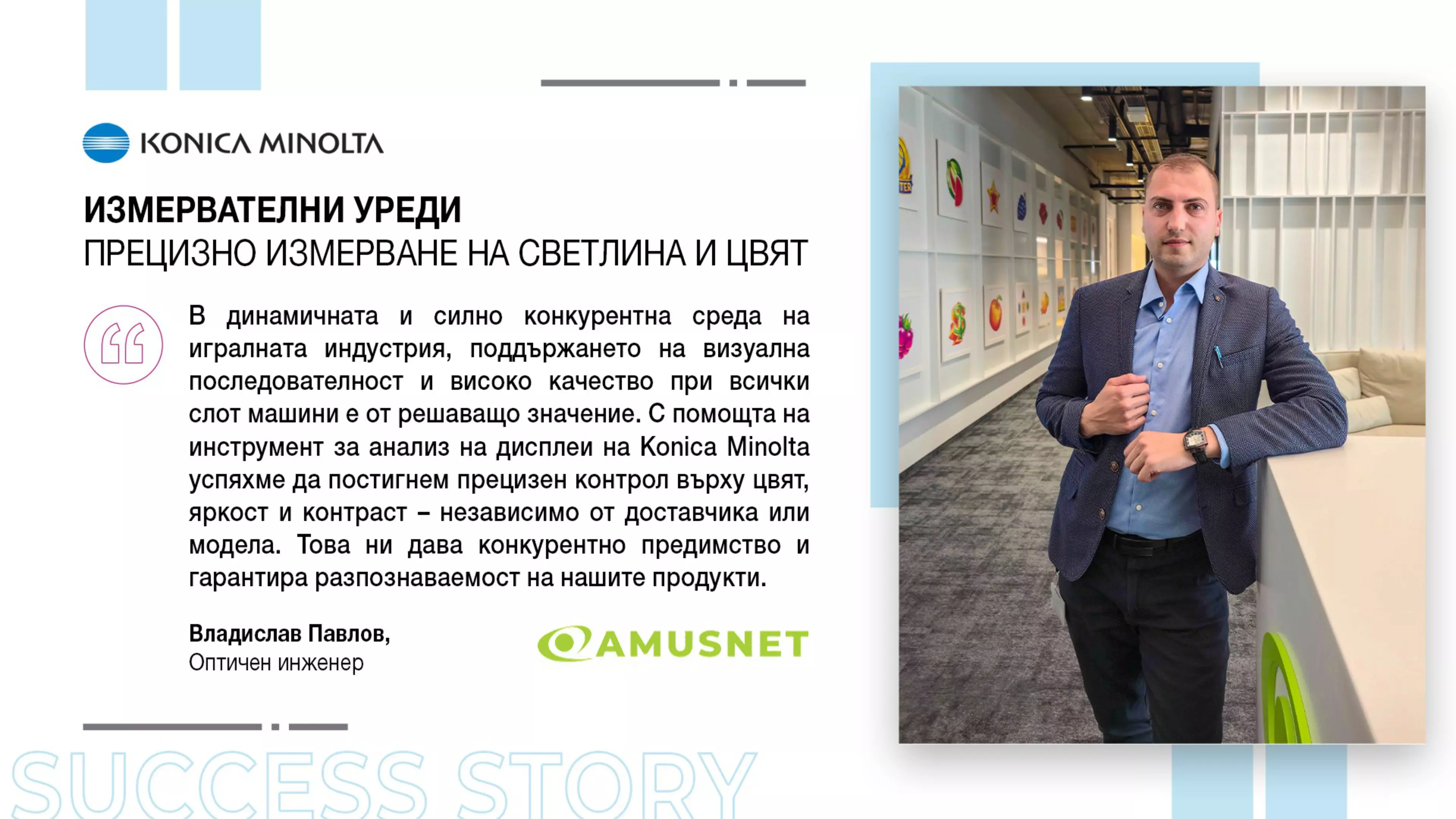 В стремежа си да гарантира визуална консистентност и високо качество във всички свои слот машини, Amusnet – водещ доставчик на казино решения – избра Коника Минолта България за надежден партньор в прецизното измерване и контрол на оптичните параметри на своите продукти.